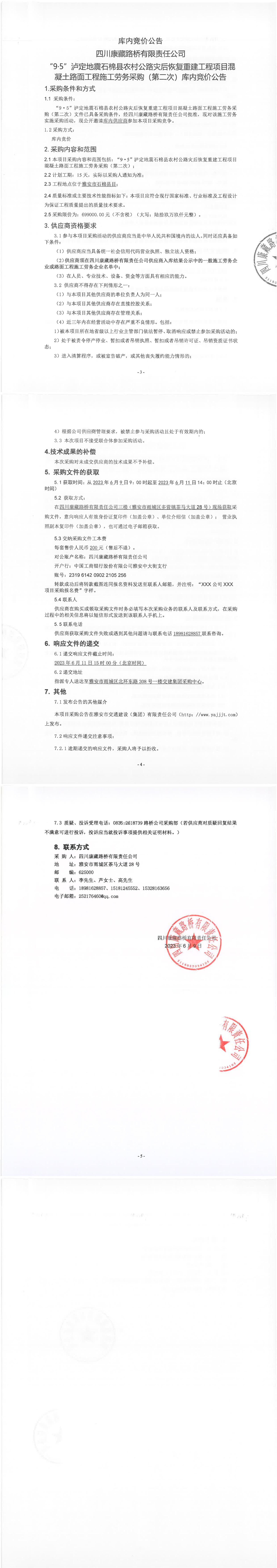 四川康藏路橋有限責(zé)任公司“9·5”瀘定地震石棉縣農(nóng)村公路災(zāi)后恢復(fù)重建工程項(xiàng)目混凝土路面工程施工勞務(wù)采購(第二次)庫內(nèi)競價(jià)公告