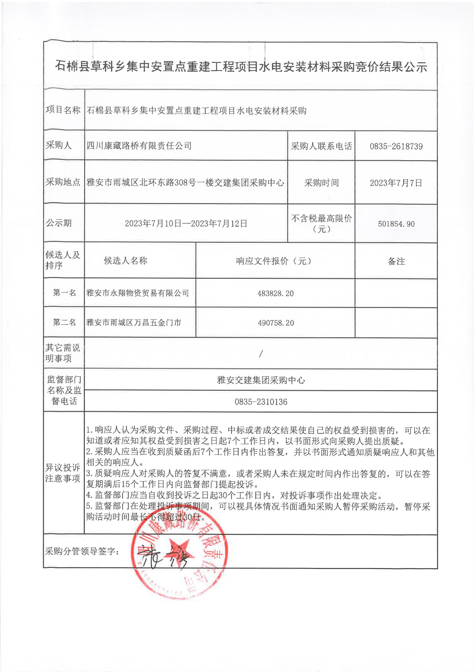 四川康藏路橋有限責(zé)任公司石棉草科鄉(xiāng)集中安置點(diǎn)重建工程項(xiàng)目水電安裝材料采購競價結(jié)果公示