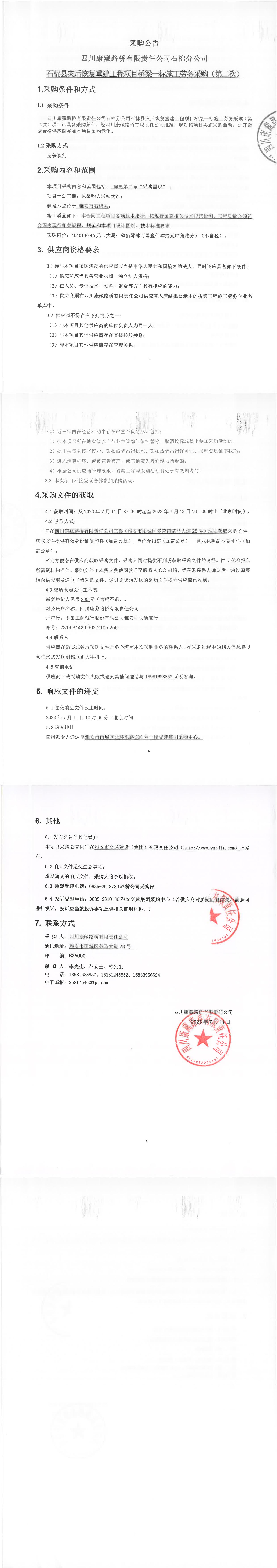 四川康藏路橋有限責(zé)任公司石棉縣災(zāi)后恢復(fù)重建工程項目橋梁一標(biāo)段施工勞務(wù)采購(第二次)