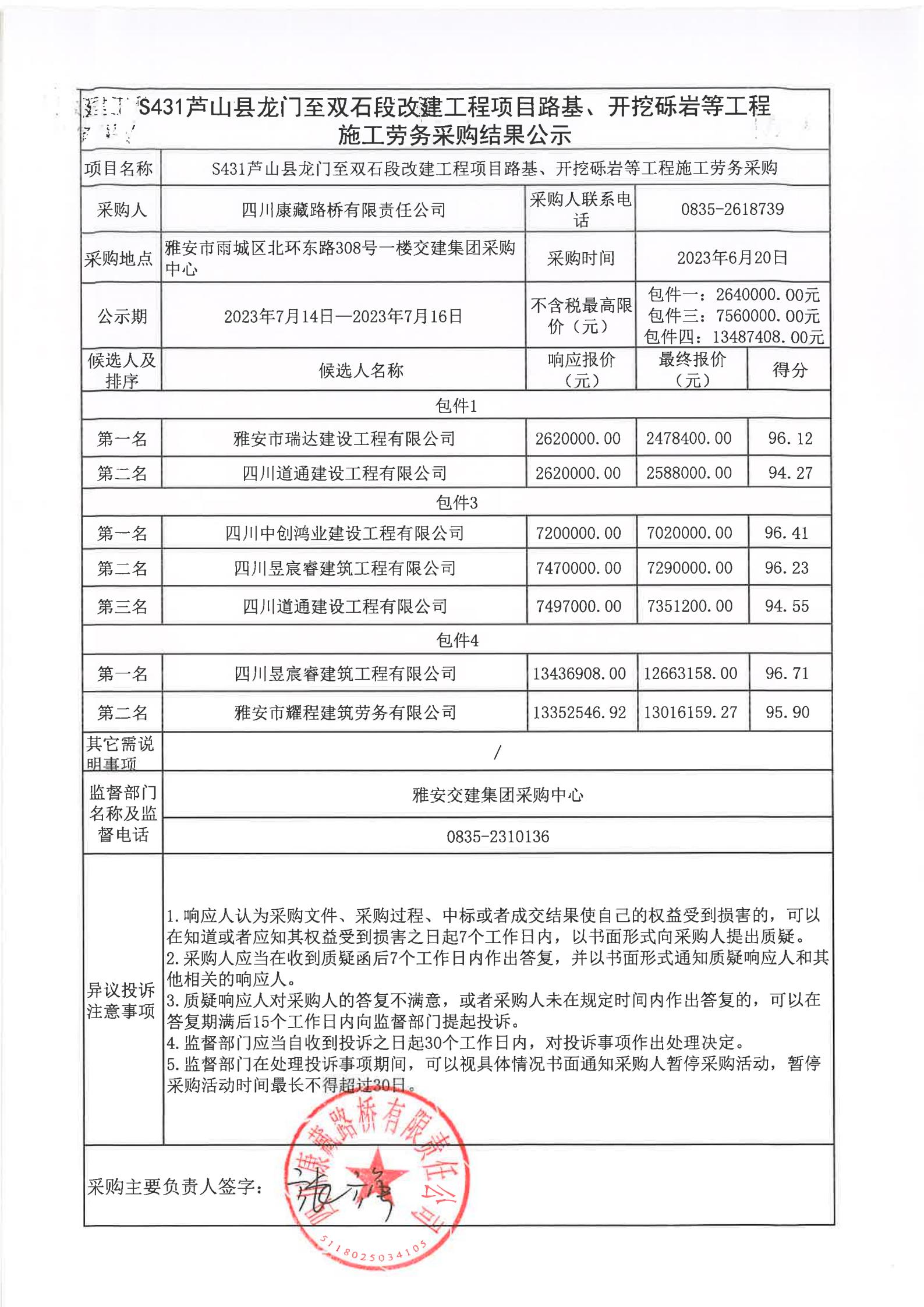 四川康藏路橋有限責(zé)任公司S431蘆山縣龍門至雙石段改建工程項(xiàng)目路基、開挖礫巖等工程施工勞務(wù)采購結(jié)果公示