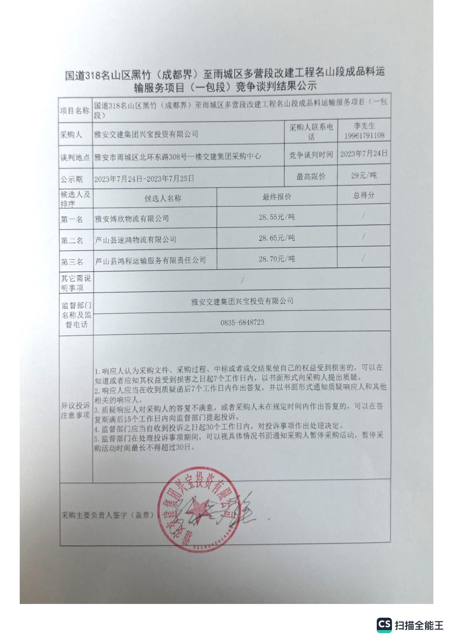 雅安交建集團興寶投資有限公司國道318名山區(qū)黑竹(成都界)至雨城區(qū)多營段改建工程名山段成品料運輸服務(wù)項目(一包段)競爭談判結(jié)果公示