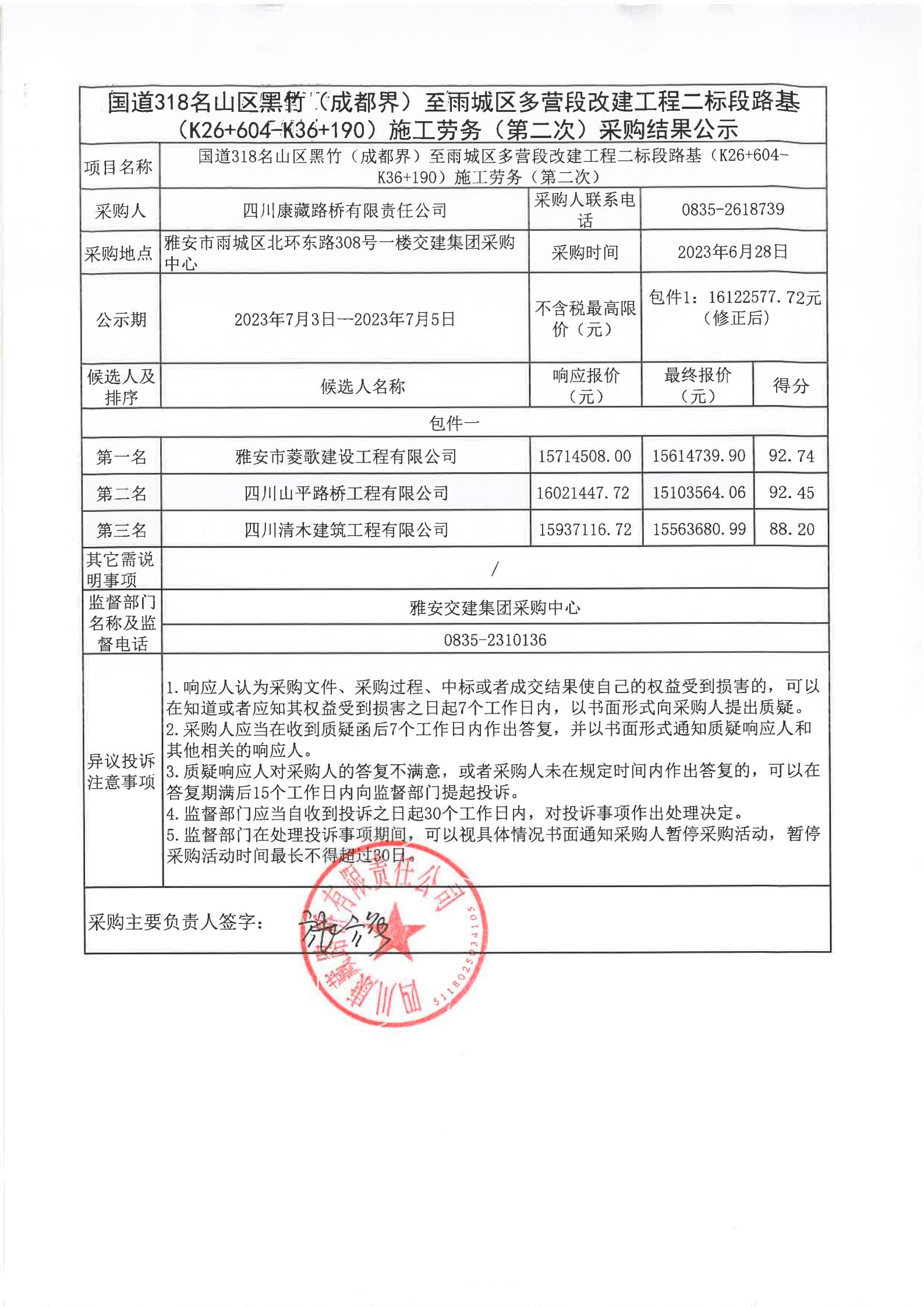 四川康藏路橋有限責(zé)任公司國(guó)道318名山區(qū)黑竹(成都界)至雨城區(qū)多營(yíng)段改建工程二標(biāo)段路基(K26+604-K36+190)施工勞務(wù)(第二次)采購(gòu)結(jié)果公示