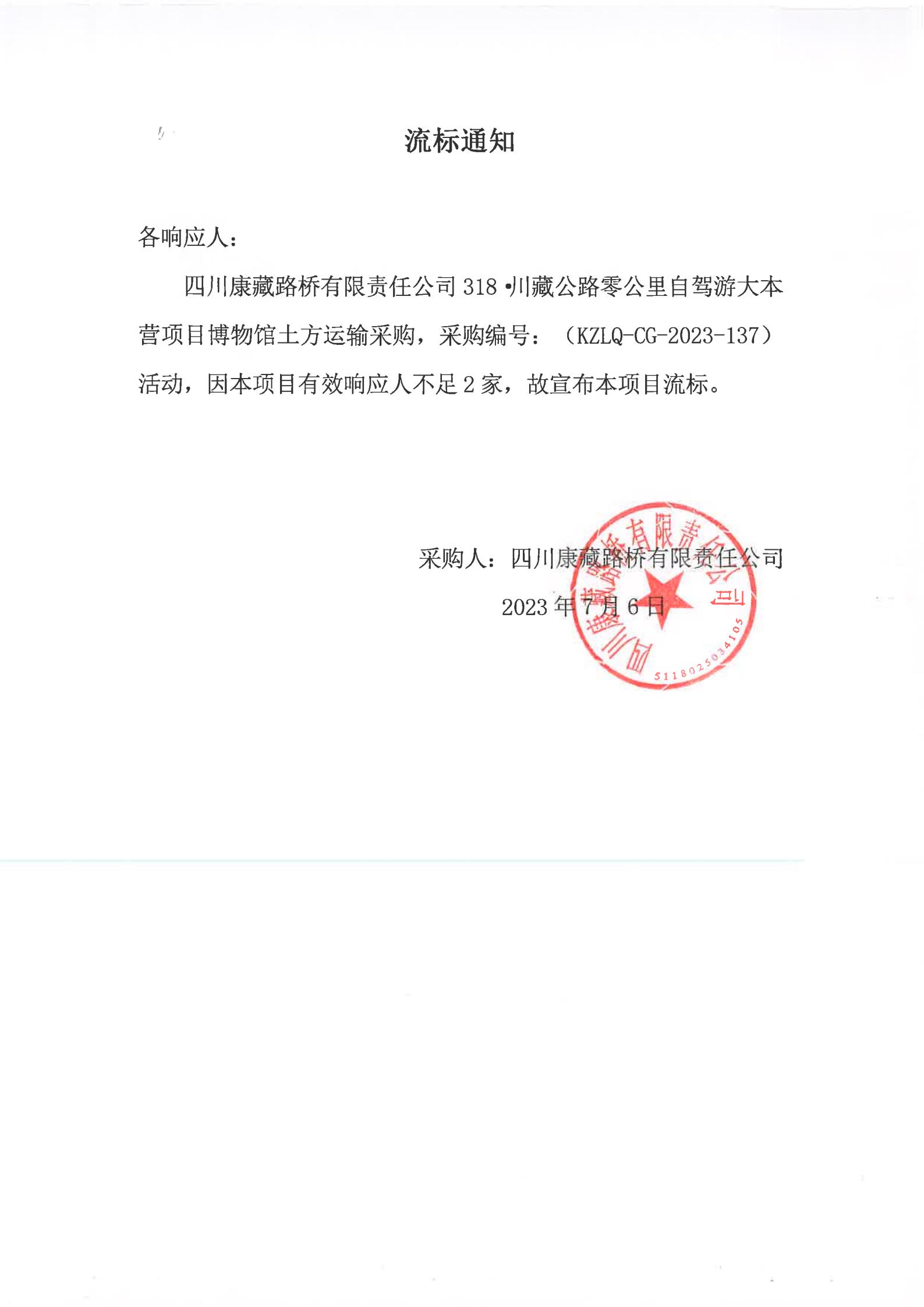 四川康藏路橋有限責任公司318·川藏公路零公里自駕游大本營項目博物館土方運輸采購流標通知