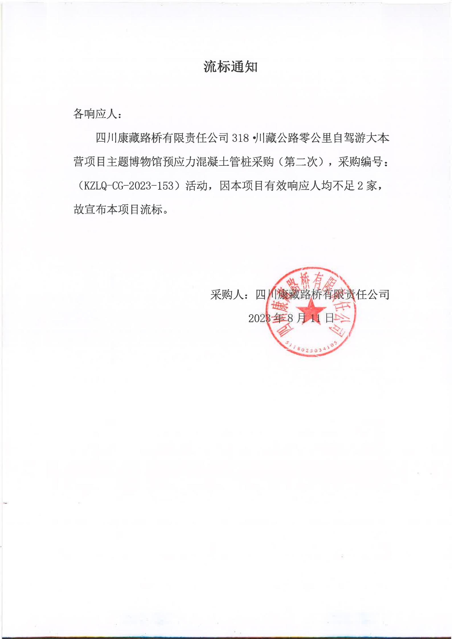 四川康藏路橋有限責(zé)任公司318·川藏公路零公里自駕游大本營(yíng)項(xiàng)目主題博物館預(yù)應(yīng)力混凝土管樁采購(gòu)(第二次)流標(biāo)通知