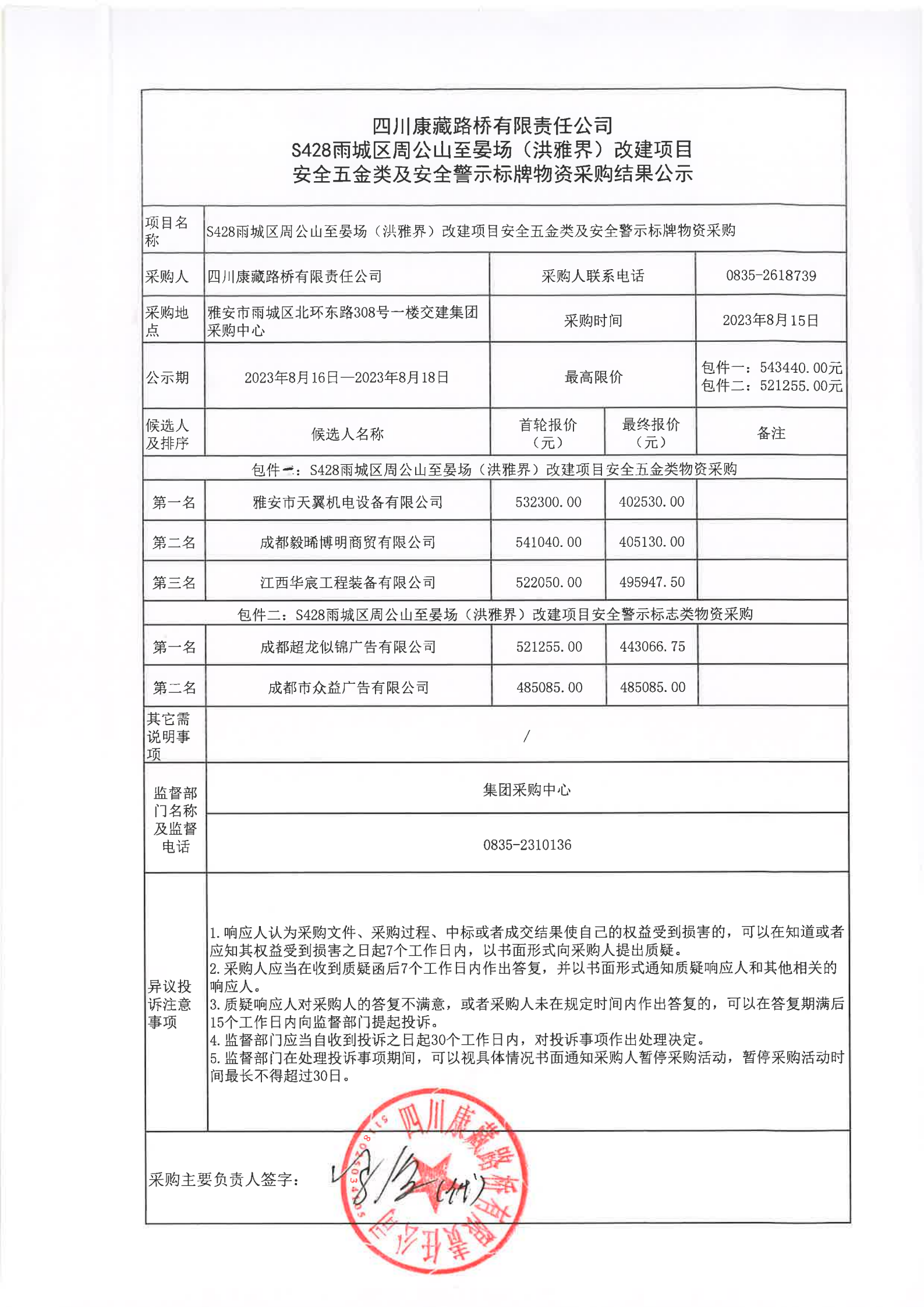 四川康藏路橋有限責(zé)任公司S428雨城區(qū)周公山至晏場(洪雅界)改建項目安全五金類及安全警示標(biāo)牌物資采購結(jié)果公示