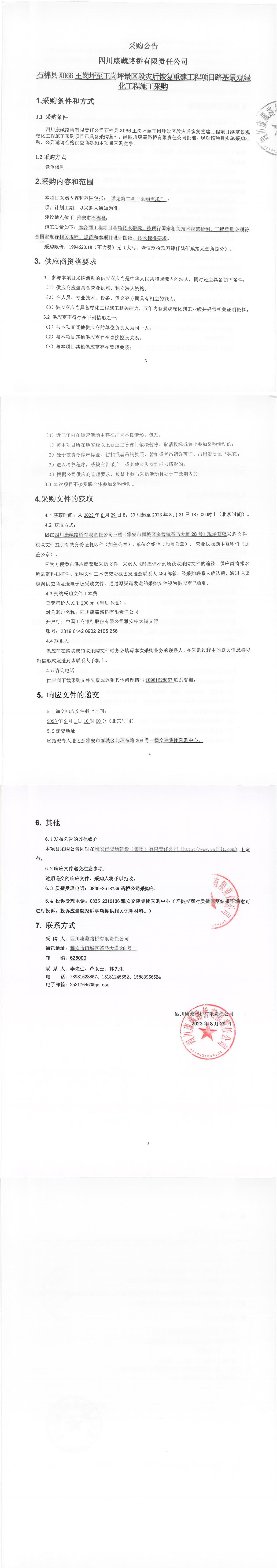 四川康藏路橋有限責(zé)任公司石棉縣X066王崗坪至王崗坪景區(qū)段災(zāi)后恢復(fù)重建工程項(xiàng)目路基景觀綠化工程施工采購(gòu)公告