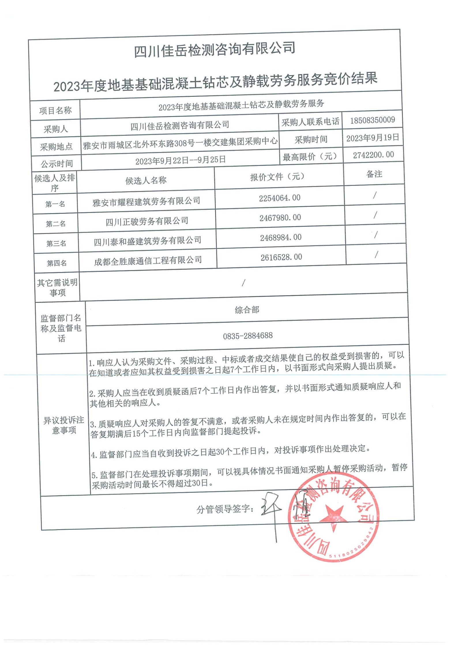 四川佳岳檢測咨詢有限公司2023年度地基基礎(chǔ)混凝土鉆芯及靜載勞務(wù)庫內(nèi)競價結(jié)果