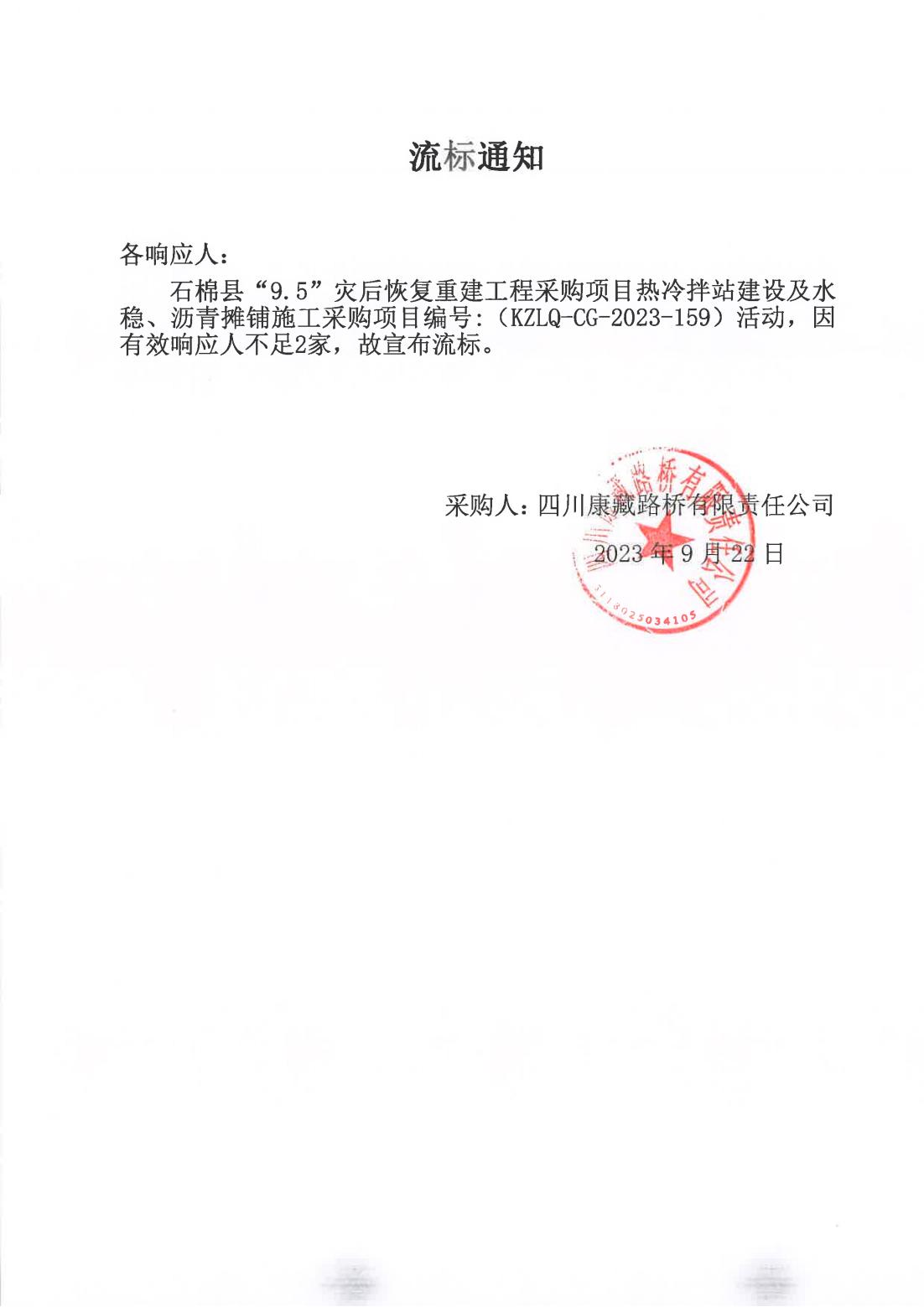 四川康藏路橋有限責(zé)任公司石棉縣“9·5”災(zāi)后恢復(fù)重建工程采購項目熱冷拌站建設(shè)及水穩(wěn)、瀝青攤鋪施工采購流標通知