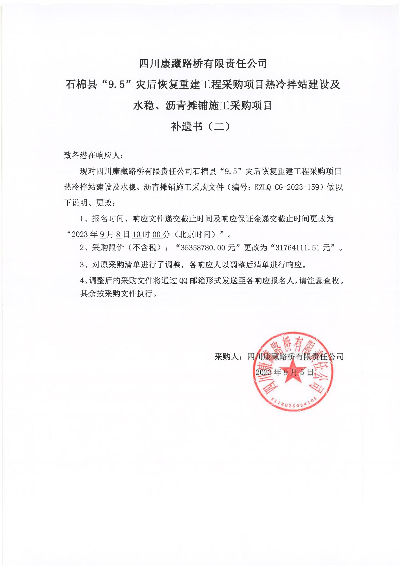 四川康藏路橋有限責(zé)任公司石棉縣“9·5”災(zāi)后恢復(fù)重建工程采購項(xiàng)目熱冷拌站建設(shè)及水穩(wěn)、瀝青攤鋪施工采購項(xiàng)目補(bǔ)遺書(二)