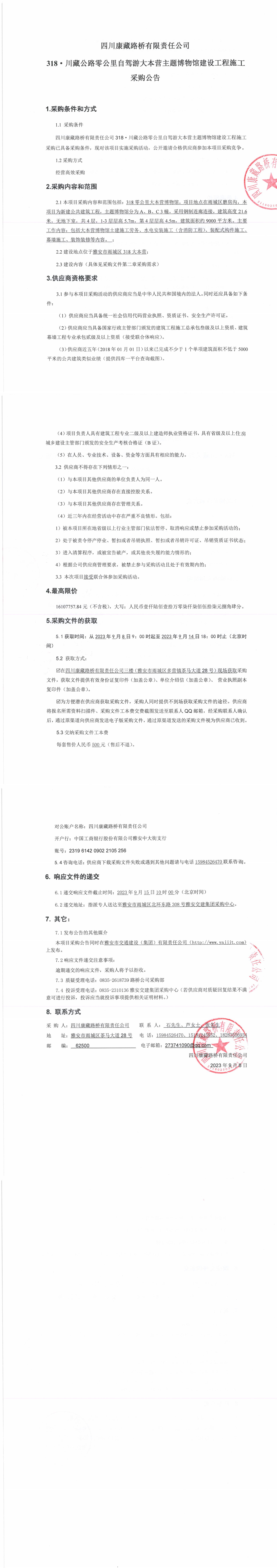 四川康藏路橋有限責(zé)任公司318·川藏公路零公里自駕游大本營主題博物館建設(shè)工程施工采購公告