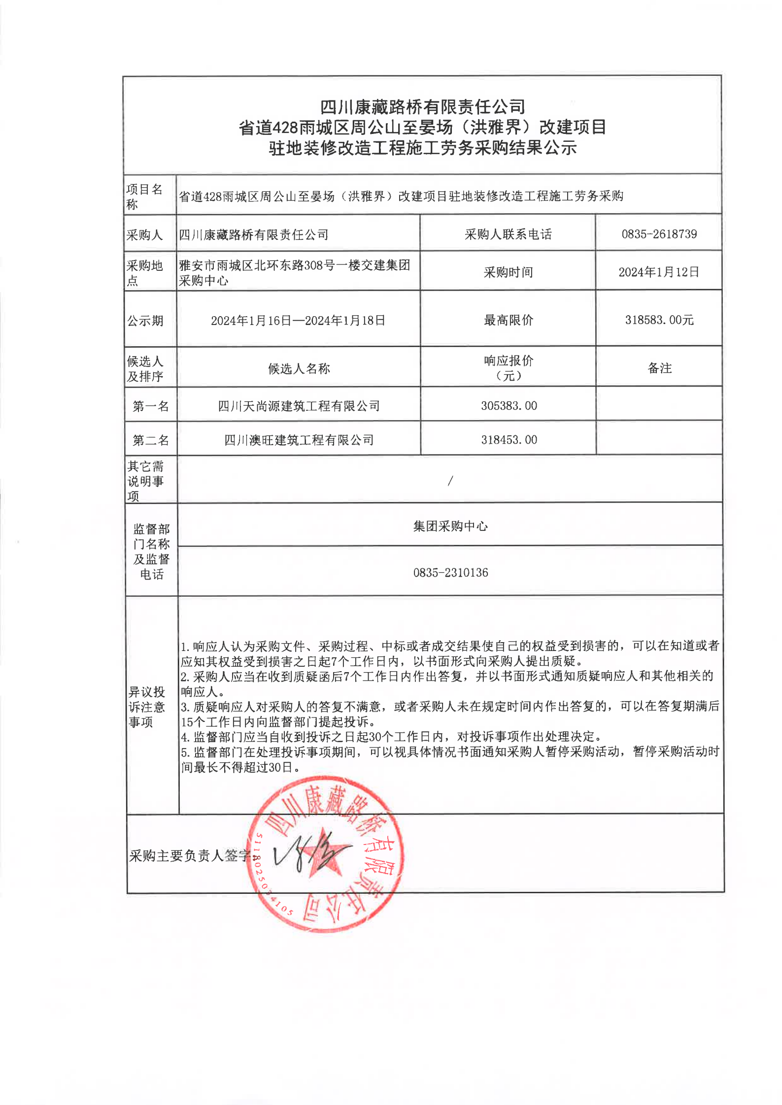 四川康藏路橋有限責任公司省道428雨城區(qū)周公山至晏場(洪雅界)改建項目駐地裝修改造工程施工勞務采購結(jié)果公示