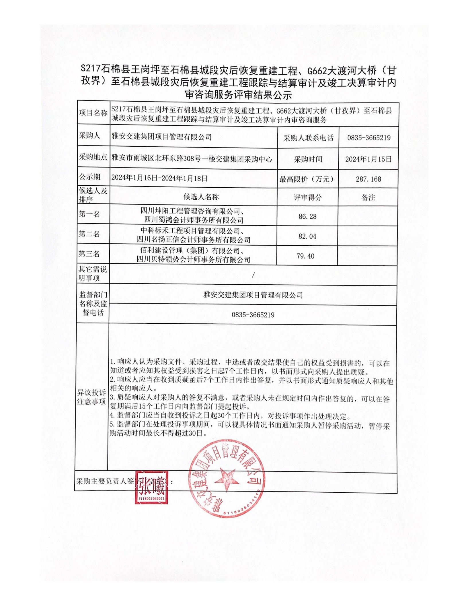雅安交建集團(tuán)項(xiàng)目管理有限公司S217石棉縣王崗坪至石棉縣城段災(zāi)后恢復(fù)重建工程、G662大渡河大橋(甘孜界)至石棉縣城段災(zāi)后恢復(fù)重建工程跟蹤與結(jié)算審計(jì)及竣工決算審計(jì)內(nèi)審咨詢服務(wù)評(píng)審結(jié)果公示