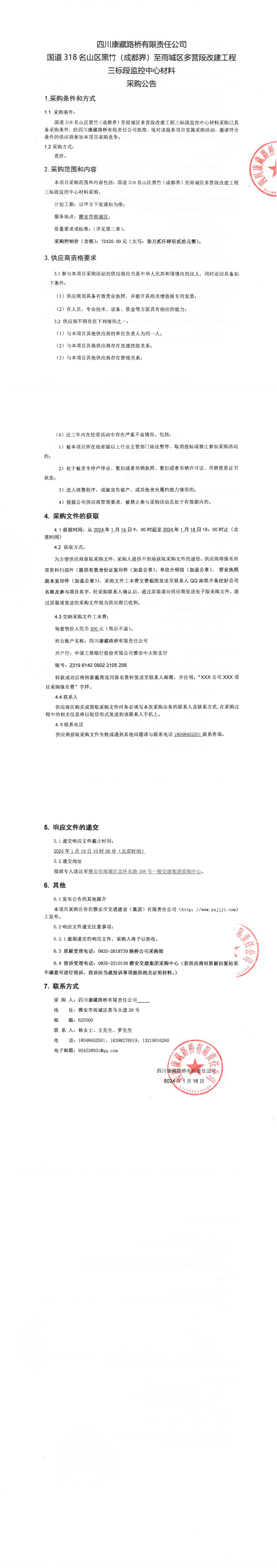 四川康藏路橋有限責(zé)任公司國道318名山區(qū)黑竹(成都界)至雨城區(qū)多營段改建工程三標段監(jiān)控中心材料采購公告