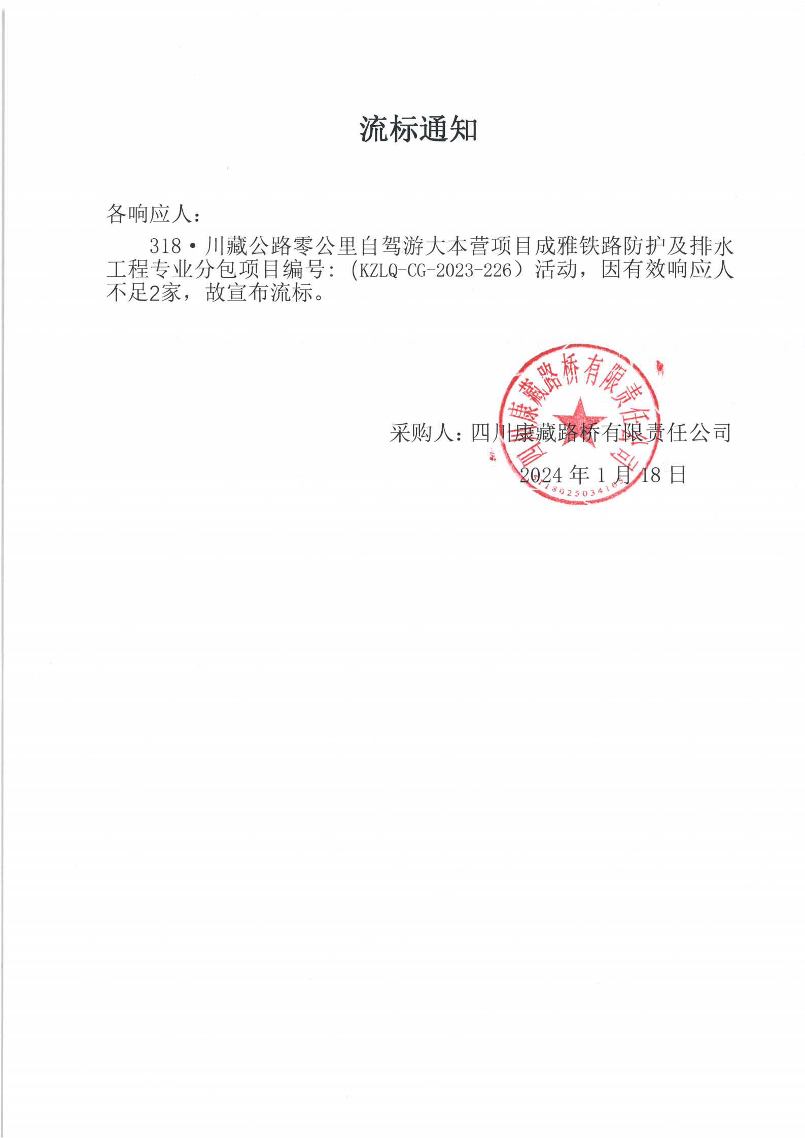 四川康藏路橋有限責(zé)任公司318·川藏公路零公里自駕游大本營項(xiàng)目成雅鐵路防護(hù)及排水工程專業(yè)分包項(xiàng)目流標(biāo)通知