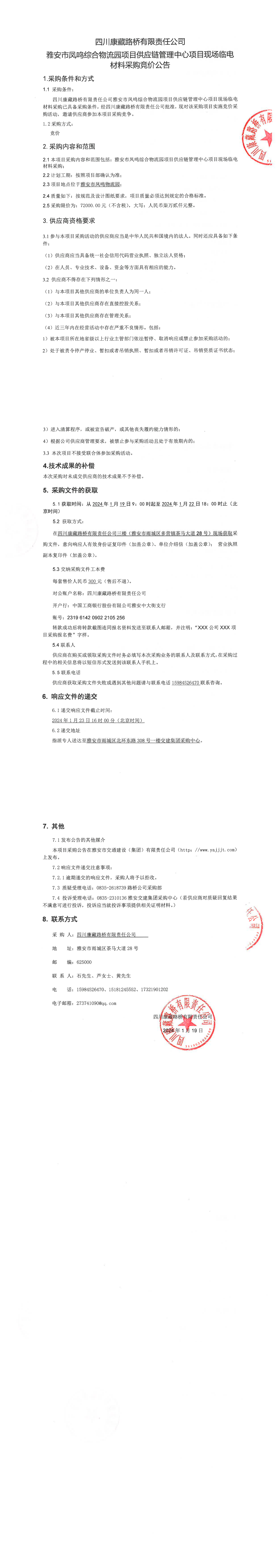 四川康藏路橋有限責任公司雅安市鳳鳴綜合物流園項目供應鏈管理中心項目現(xiàn)場臨電材料采購競價公告