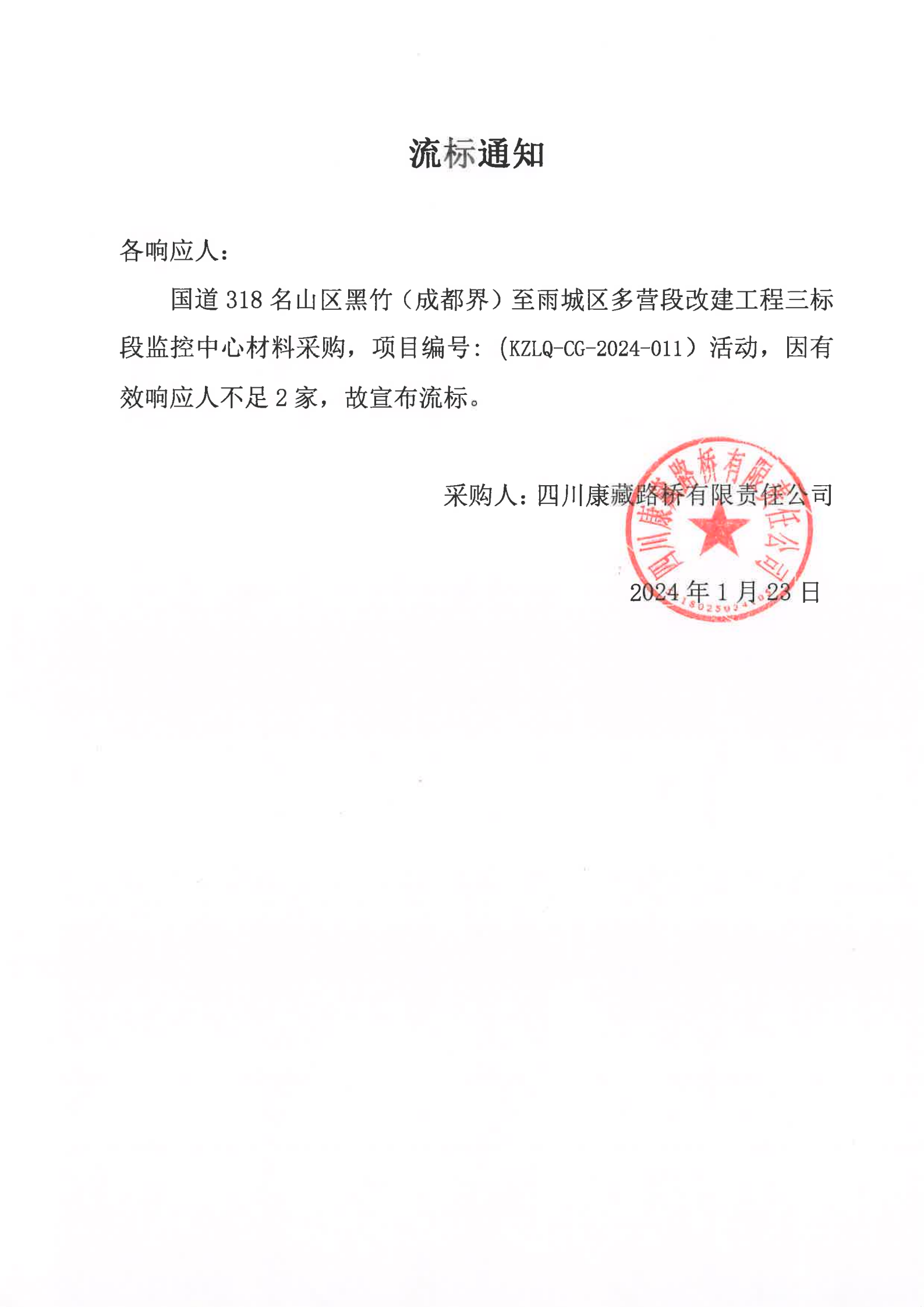 四川康藏路橋有限責(zé)任公司國道318名山區(qū)黑竹(成都界)至雨城區(qū)多營段改建工程三標(biāo)段監(jiān)控中心材料采購流標(biāo)通知