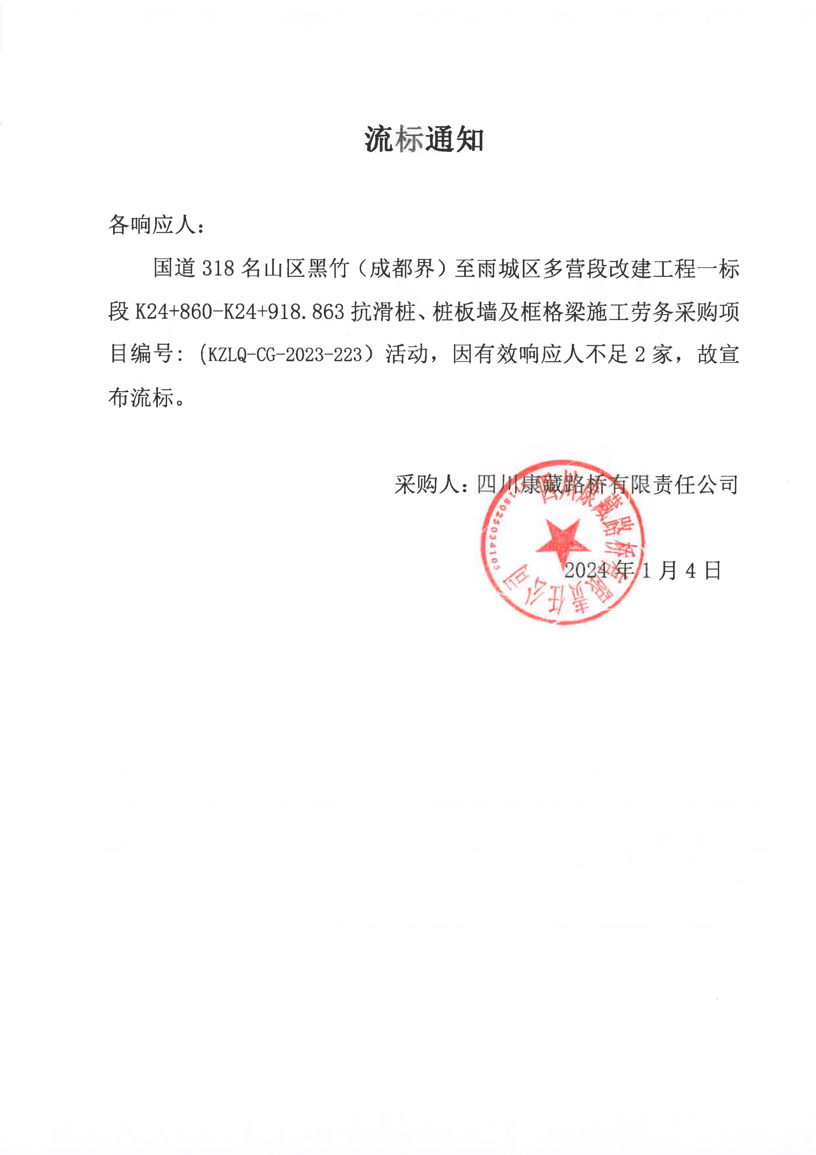 四川康藏路橋有限責(zé)任公司國道318名山區(qū)黑竹(成都界)至雨城區(qū)多營段改建工程一標(biāo)段K24+860-K24+918.863抗滑樁、樁板墻及框格梁施工勞務(wù)采購項目流標(biāo)通知