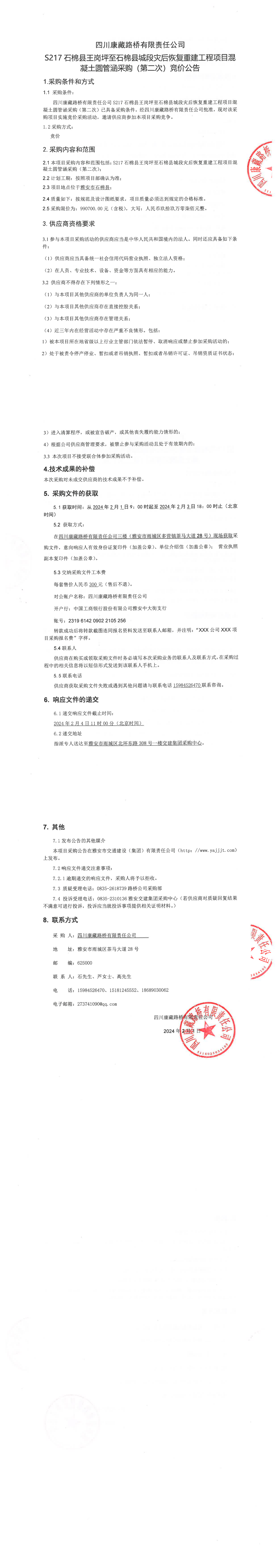 四川康藏路橋有限責(zé)任公司S217石棉縣王崗坪至石棉縣城段災(zāi)后恢復(fù)重建工程項(xiàng)目混凝土圓管涵采購(第二次)競價公告