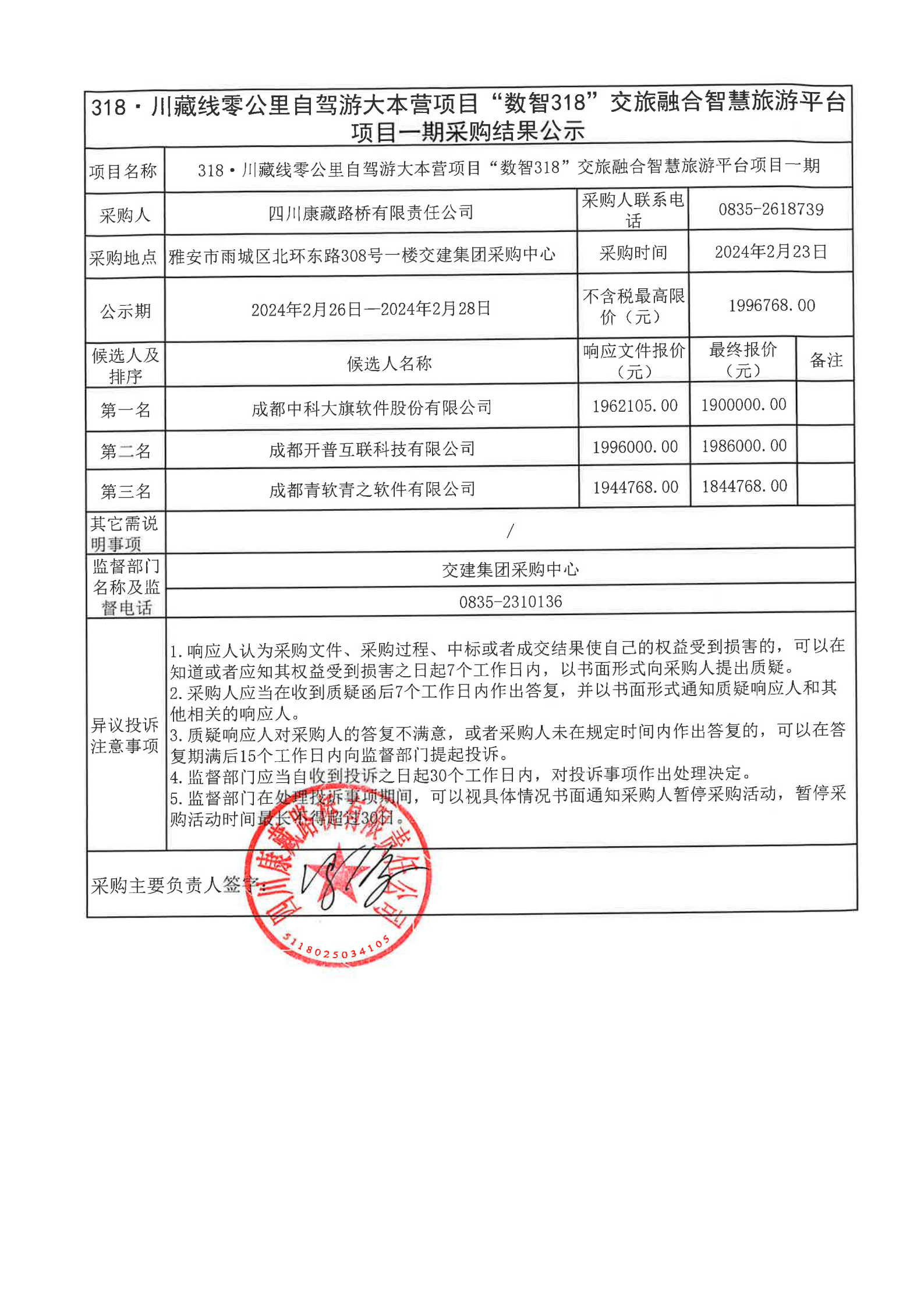 四川康藏路橋有限責任公司318·川藏公路零公里自駕游大本營項目“數智318”交旅融合智慧旅游平臺項目一期采購結果公示