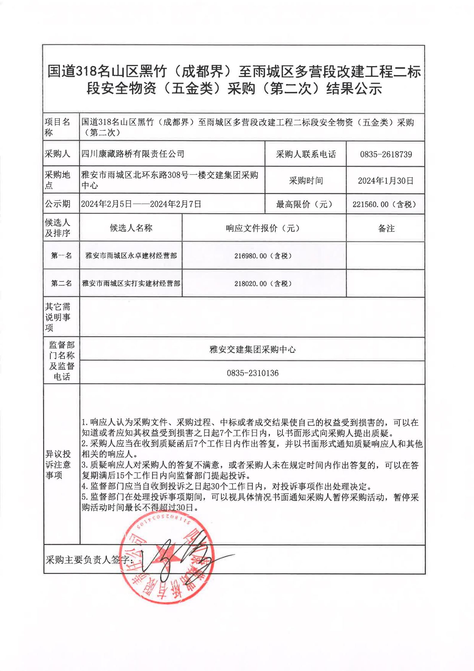 四川康藏路橋有限責(zé)任公司國(guó)道318名山區(qū)黑竹(成都界)至雨城區(qū)多營(yíng)段改建工程二標(biāo)段安全物資(五金類)采購(第二次)結(jié)果公示