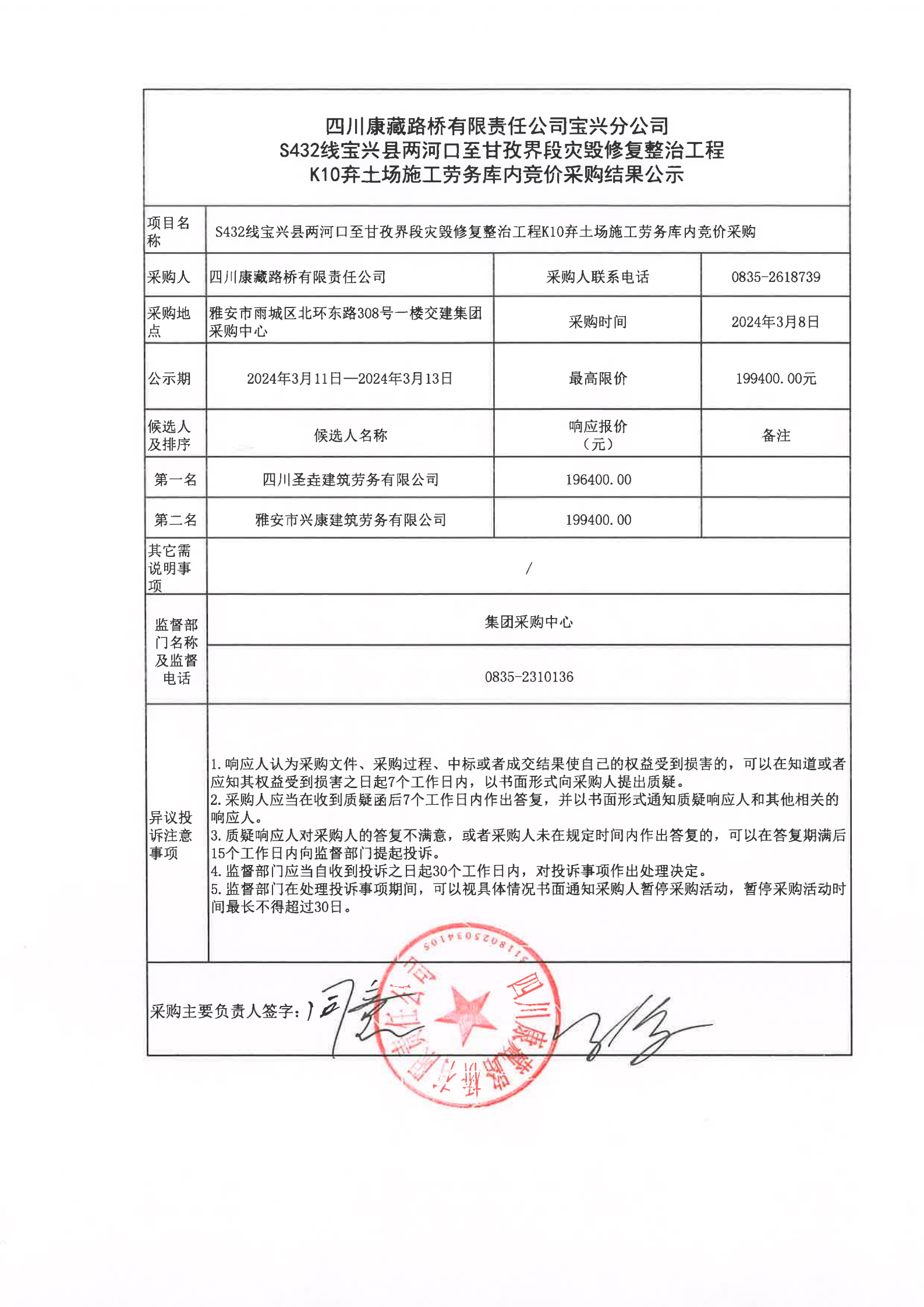 四川康藏路橋有限責(zé)任公司寶興分公司S432線寶興縣兩河口至甘孜界段災(zāi)毀修復(fù)整治工程K10棄土場(chǎng)施工勞務(wù)庫(kù)內(nèi)采購(gòu)結(jié)果公示
