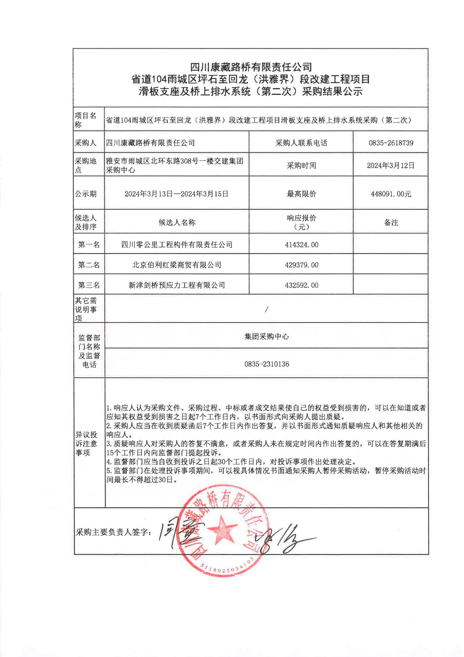 四川康藏路橋有限責(zé)任公司省道104雨城區(qū)坪石至回龍(洪雅界)段改建工程項目滑板支座及橋上排水系統(tǒng)(第二次)采購結(jié)果公示