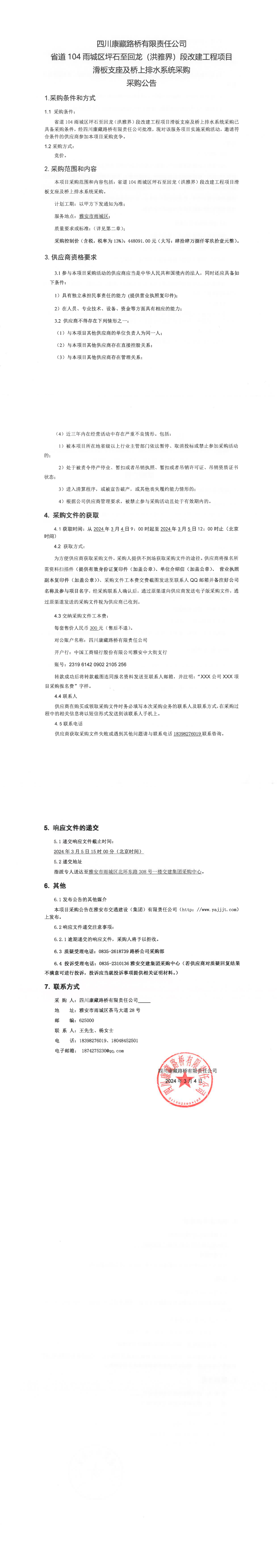 四川康藏路橋有限責(zé)任公司省道104雨城區(qū)坪石至回龍(洪雅界)段改建工程項(xiàng)目滑板支座及橋上排水系統(tǒng)采購公告