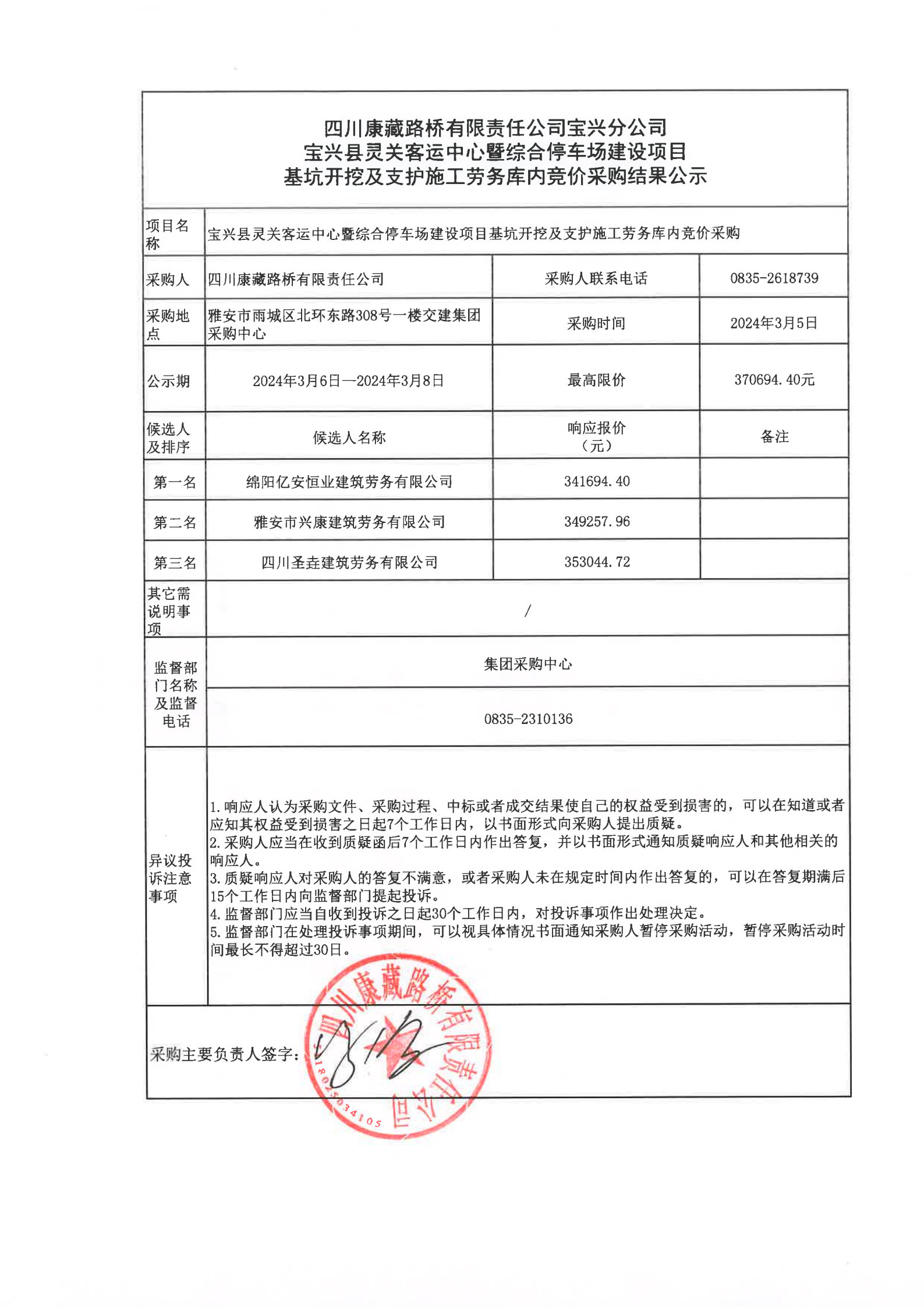 四川康藏路橋有限責(zé)任公司寶興分公司寶興縣靈關(guān)客運(yùn)中心暨綜合停車(chē)場(chǎng)建設(shè)項(xiàng)目基坑開(kāi)挖及支護(hù)施工勞務(wù)庫(kù)內(nèi)競(jìng)價(jià)采購(gòu)結(jié)果公示