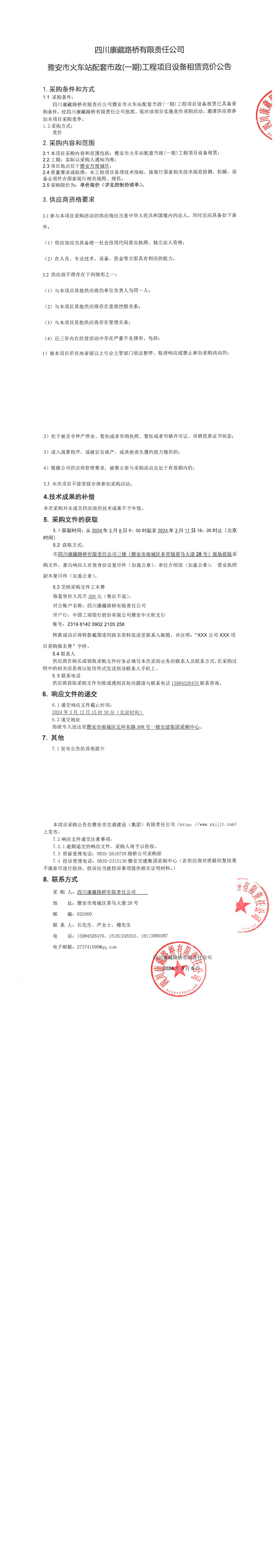 四川康藏路橋有限責(zé)任公司雅安市火車站配套市政(一期)工程項(xiàng)目設(shè)備租賃競價(jià)公告