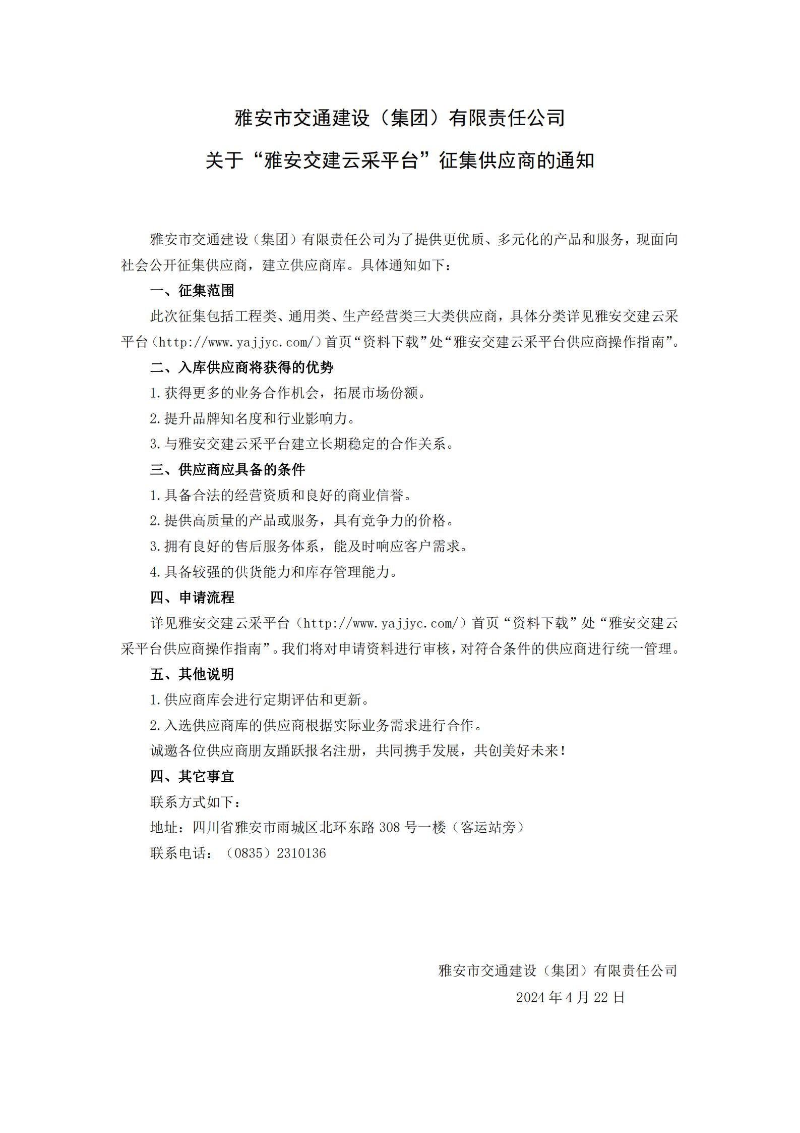 雅安市交通建設(shè)(集團(tuán))有限責(zé)任公司關(guān)于“雅安交建云采平臺(tái)”征集供應(yīng)商的通知