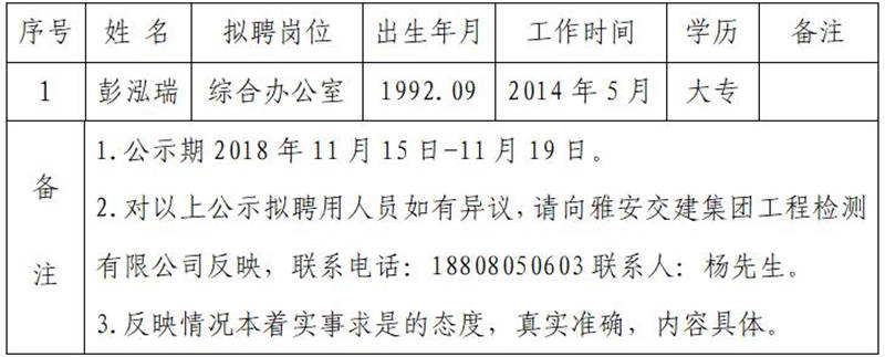 通過公開報(bào)名、資格審查、綜合測試等程序,經(jīng)雅安交建集團(tuán)工程檢測有限公司研究擇優(yōu)確定以下1名擬聘用人員,現(xiàn)公示名單如下: