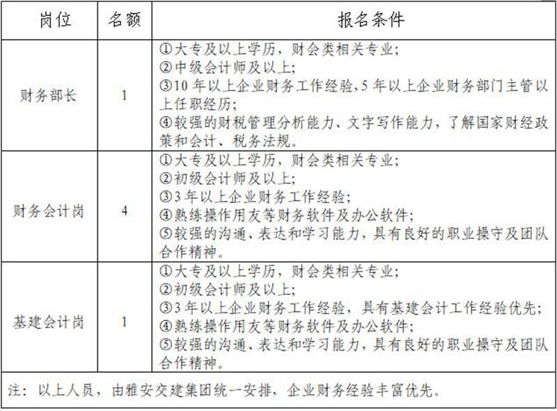 根據(jù)發(fā)展需要,決定面向社會(huì)公開(kāi)招聘雅安市交通建設(shè)(集團(tuán))有限責(zé)任公司(以下簡(jiǎn)稱“雅安交建集團(tuán)”)所屬子公司財(cái)務(wù)部門負(fù)責(zé)人1名,工作人員5名,現(xiàn)將有關(guān)事項(xiàng)公告如下: