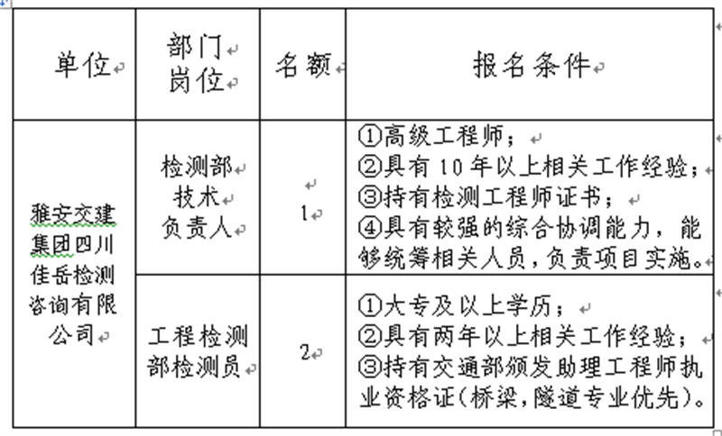 雅安交建集團(tuán)關(guān)于公開招聘所屬子公司工作人員的公告(佳岳檢測公司)