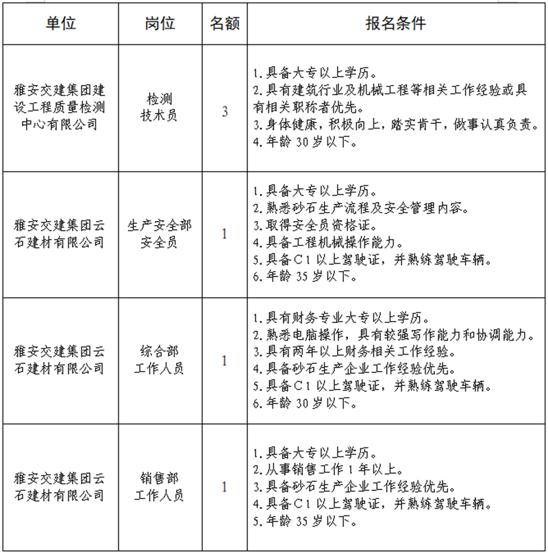 雅安交建集團(tuán)關(guān)于公開招聘所屬子公司工作人員的公告(工程檢測(cè)中心、云石公司)