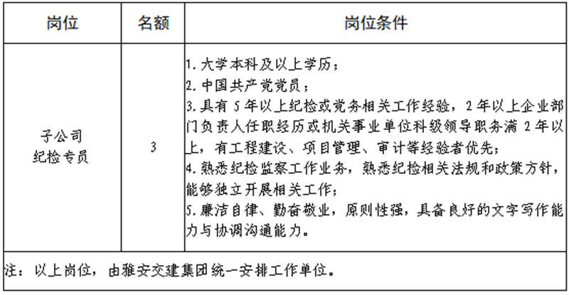 根據(jù)發(fā)展需要,決定面向社會(huì)公開(kāi)招聘雅安市交通建設(shè)(集團(tuán))有限責(zé)任公司(以下簡(jiǎn)稱“雅安交建集團(tuán)”)所屬子公司紀(jì)檢專員3名,現(xiàn)將有關(guān)事項(xiàng)公告如下: