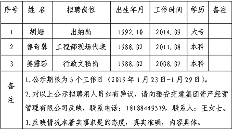 通過公開報(bào)名、資格審查、筆試、面試等程序,經(jīng)雅安交建集團(tuán)資產(chǎn)經(jīng)營(yíng)管理有限公司研究,對(duì)以下3名擬聘用人員予以公示: