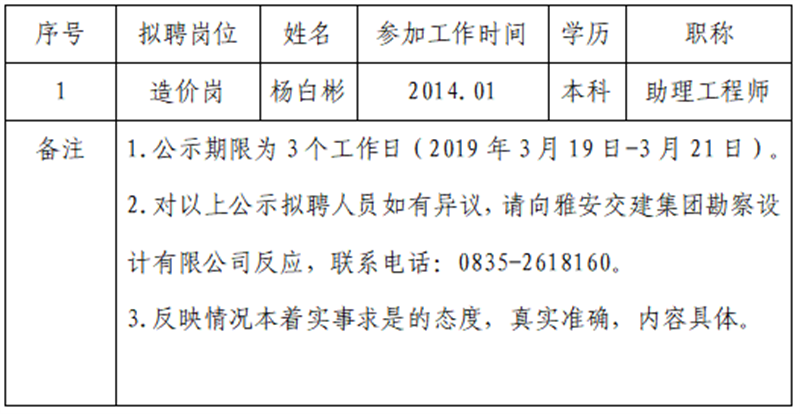雅安交建集團勘察設(shè)計有限公司擬聘用人員公示