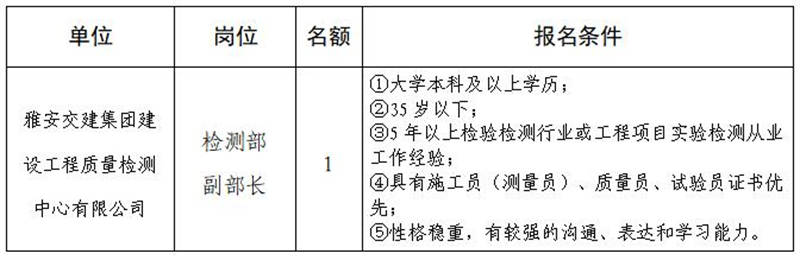 根據(jù)發(fā)展需要,決定面向社會公開招聘雅安市交通建設(集團)有限責任公司(以下簡稱“雅安交建集團”)所屬子公司中層干部1名,現(xiàn)將有關事項公告如下: