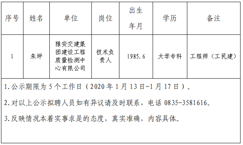 雅安交建集團(tuán)子公司擬聘用人員公示 (工程檢測(cè)中心)