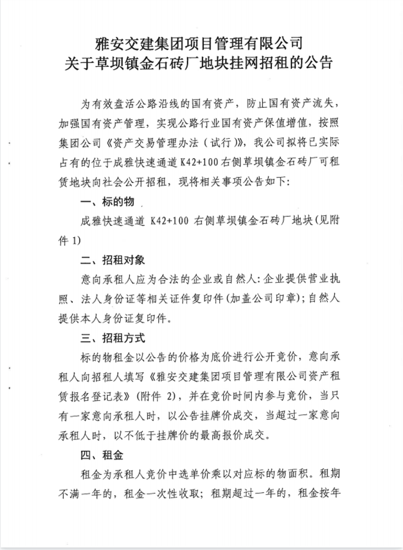 關(guān)于金石磚廠地塊公開(kāi)招租的公告