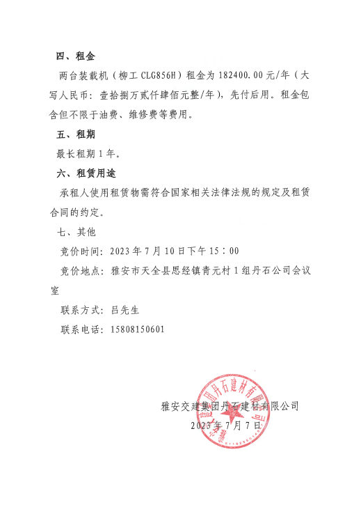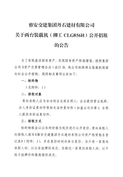 雅安交建集團(tuán)丹石建材有限公司關(guān)于2臺(tái)裝載機(jī)公開(kāi)招租的公告