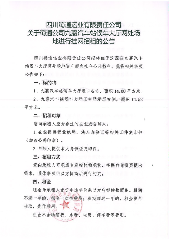 四川蜀通運業(yè)有限責(zé)任公司關(guān)于蜀通公司九襄汽車站候車大廳兩處場地進行掛網(wǎng)招租的公告