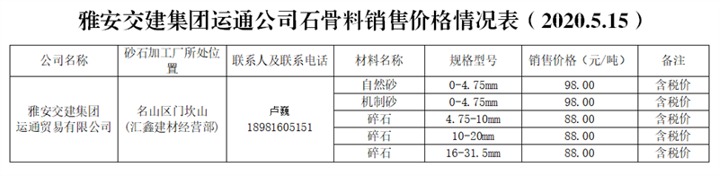 運通貿(mào)易有限公司。運通公司是雅安市交通建設(shè)(集團)有限責任公司獨資子公司,主要負責雨城區(qū)中心城區(qū)河道外砂石經(jīng)營管理工作。目前,公司與名山區(qū)匯鑫建材經(jīng)營部確定了代加工合作關(guān)系,已投產(chǎn),預計年生產(chǎn)能力約30萬噸。