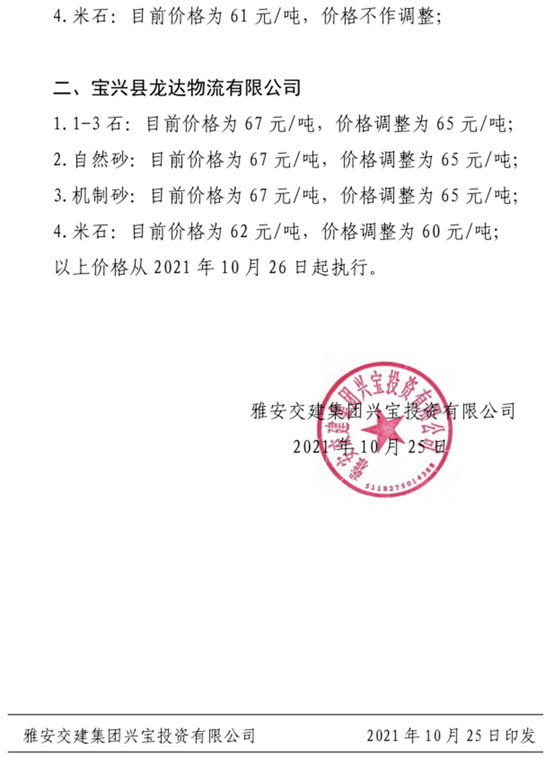 雅安交建集團(tuán)興寶公司關(guān)于調(diào)整成品料銷售價(jià)格的通知(2021.10.26)