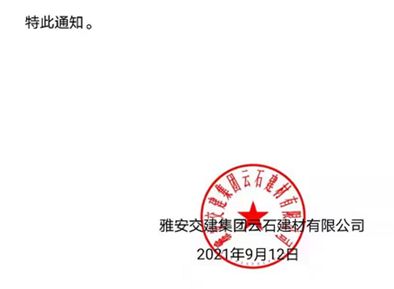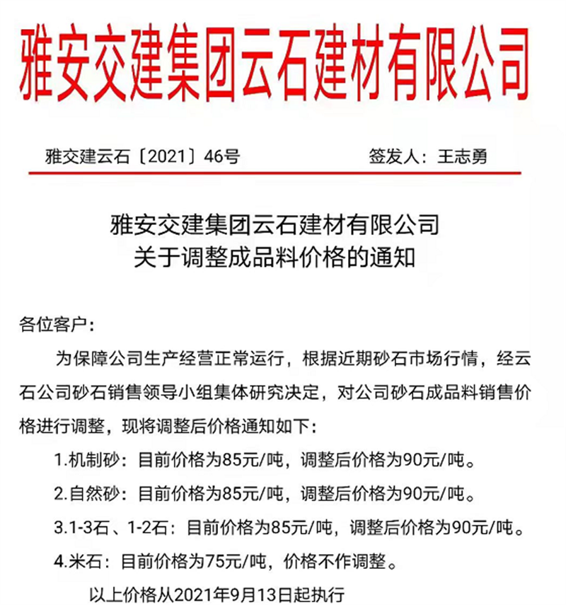 雅安交建集團(tuán)云石公司關(guān)于調(diào)整成品料銷售價(jià)格的通知(2021.9.13)
