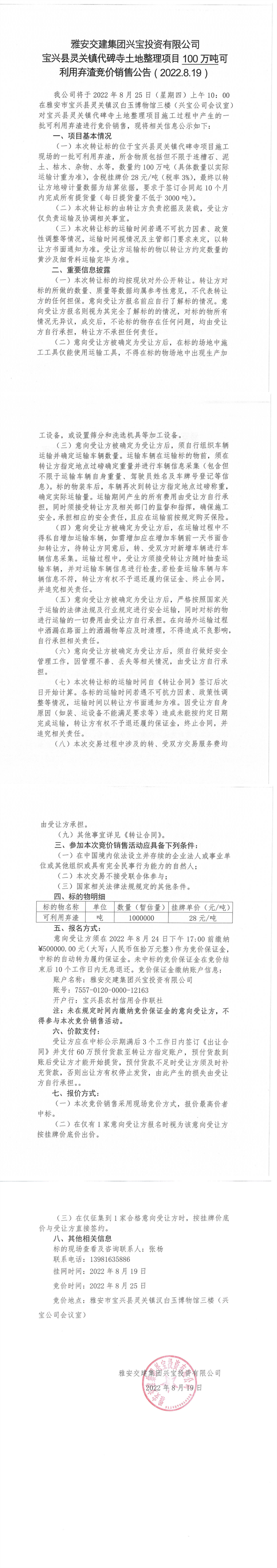 雅安交建集團(tuán)興寶投資有限公司靈關(guān)鎮(zhèn)代碑寺土地整理項(xiàng)目10萬(wàn)噸可利用棄渣競(jìng)價(jià)銷(xiāo)售公告(2022.8.19)(1)