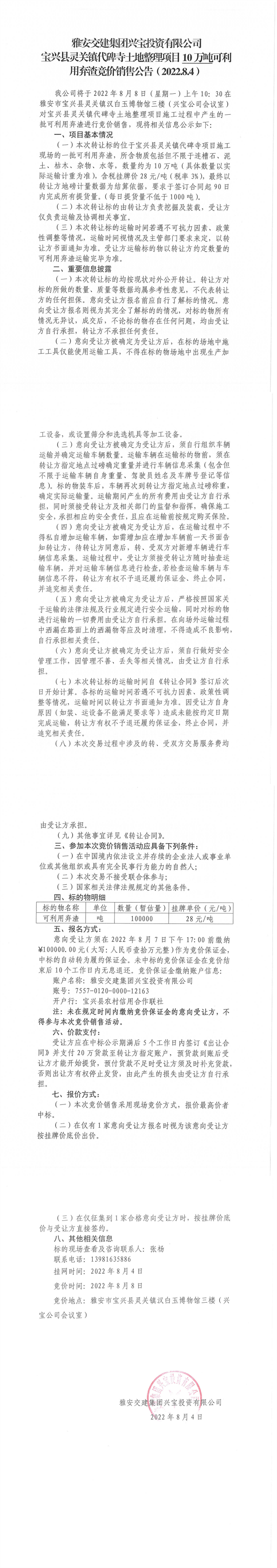 雅安交建集團(tuán)興寶投資有限公司靈關(guān)鎮(zhèn)代碑寺土地整理項(xiàng)目10萬(wàn)噸可利用棄渣競(jìng)價(jià)銷售公告(2022.8.4)