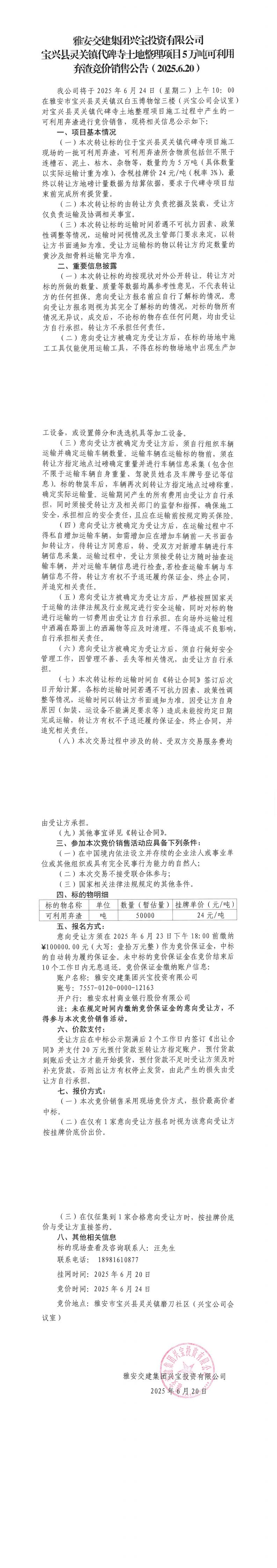 雅安交建集團(tuán)興寶投資有限公司寶興縣靈關(guān)鎮(zhèn)代碑寺土地整理項(xiàng)目10萬噸可利用棄渣競價(jià)銷售公告